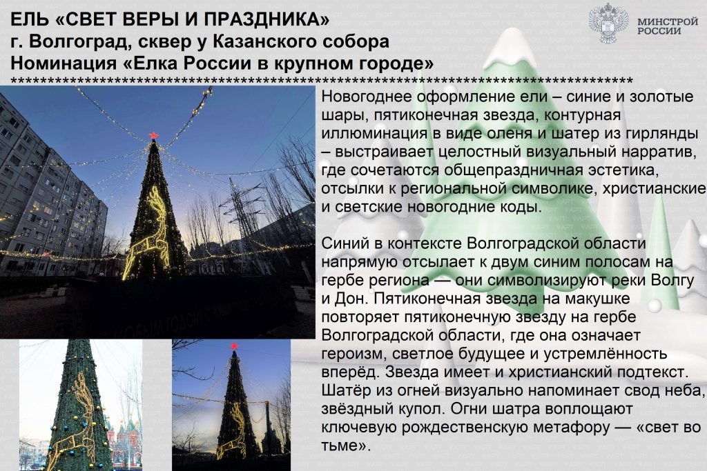 Лучшая аутентичная новогодняя елка Волгоградской области принимает участие в федеральном этапе Всероссийского конкурса «Ёлки России» в период с 10 по 13 января 2026 г. в формате открытого онлайн-голосования в социальной сети «ВКонтакте» по ссылке: https://vk.ru/wall-228435980_170